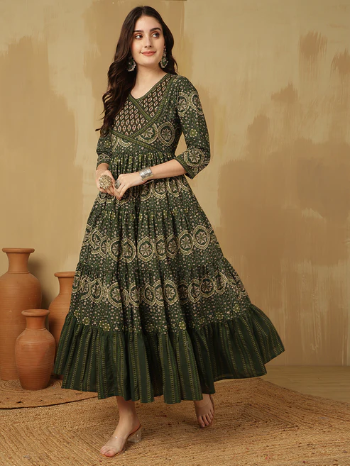 WOMEN COTTON PRINTED ANKLE LENGTH V-NECK TIERED KURTA