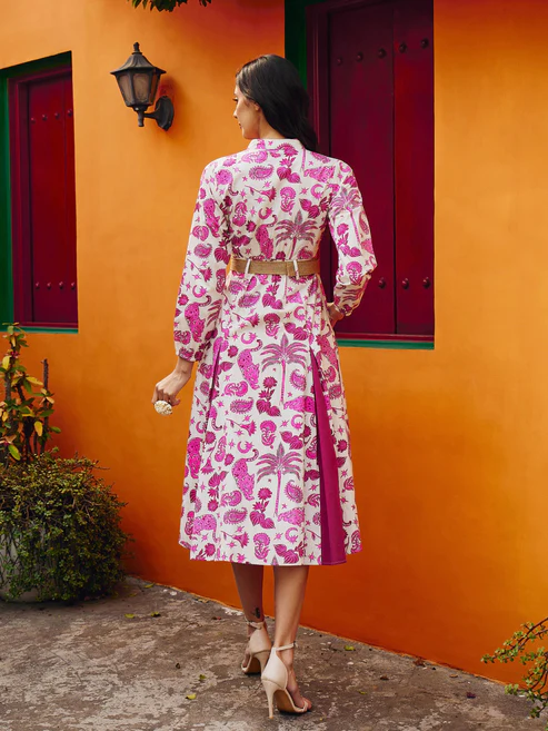 Pink Printed Kick Pleat Midi Dress, in Cotton Poplin fabric, Unlined , Midi Length, Fit & Flare, Button Closure , Flared Hemline and features Wooden Button At Front