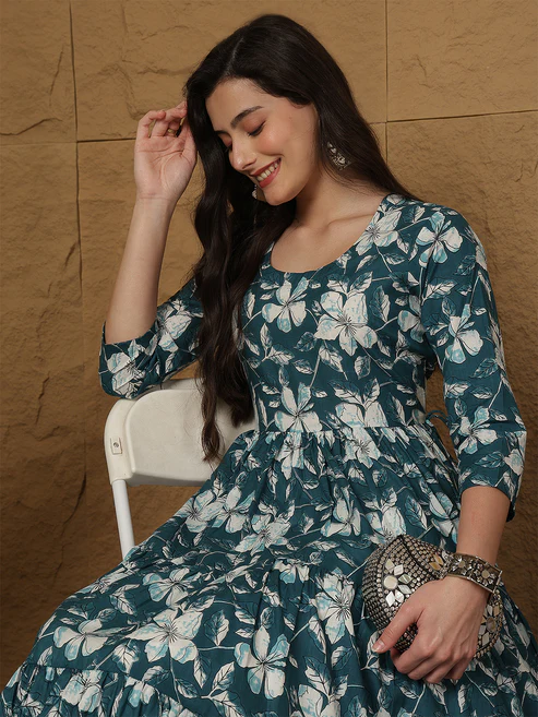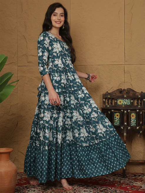 Women Rayon Printed Ankle Length Three-Quarter Sleeves Round Neck Tiered Kurta